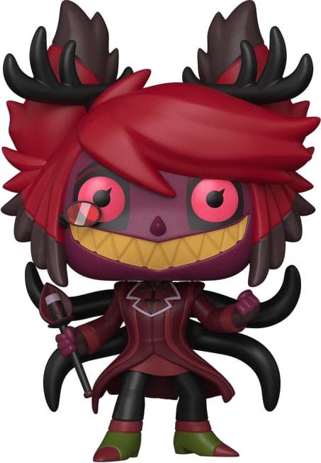 La figura muestra a Alastor con su característico cabello rojo, sonrisa amplia llena de dientes afilados y su elegante traje rojo, acompañado de detalles distintivos como sus astas y el bastón que refuerzan su presencia inquietante. El estilo cabezón de la línea POP! se combina con colores intensos que reflejan la estética del personaje en la serie.