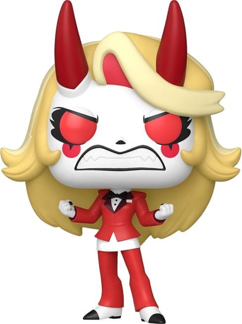 La figura muestra a Charlie con sus característicos cuernos rojos, ojos brillantes y traje rojo, pero con una pose y gesto enfadado que aporta un aire distinto al diseño habitual del personaje. El estilo inconfundible de la línea POP! mantiene las proporciones estilizadas y los detalles simplificados que han convertido estas figuras en piezas muy apreciadas.