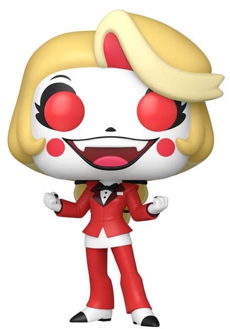 La figura muestra a Charlie con su distintivo traje rojo, cabello rubio y su amplia sonrisa acompañada de sus llamativos ojos rojos. Los detalles del vestuario y su postura transmiten la energía optimista del personaje dentro del peculiar universo del Hazbin Hotel.