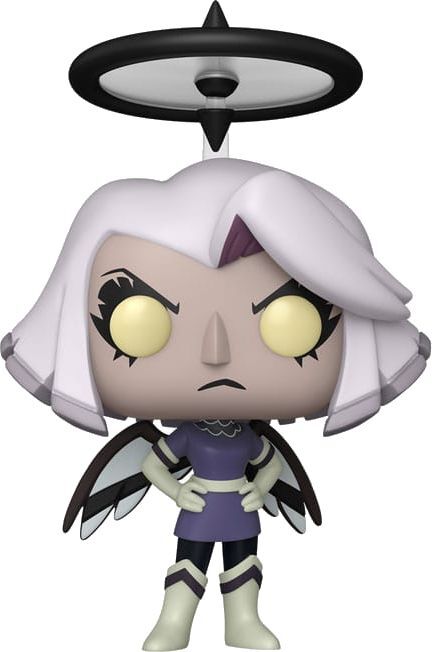 La figura muestra a Vaggie con su característico cabello blanco, mirada desafiante y una aureola flotando sobre su cabeza, acompañada de alas que refuerzan su apariencia angelical. El estilo icónico de la línea POP! mantiene los rasgos simplificados y expresivos que han convertido a estas figuras en piezas muy apreciadas por coleccionistas.
