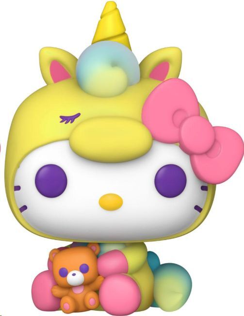 Esta figura Pop! de Hello Kitty es una combinación adorable de ternura y fantasía. Con un diseño de 9 cm de altura, presenta a la icónica gatita de Sanrio vestida con un traje de unicornio multicolor, decorado con tonos pastel como amarillo, rosa y azul. Su gran lazo rosa y los ojitos morados le dan un toque encantador que resalta a primera vista.