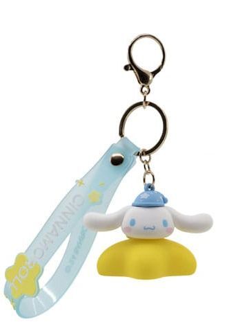 Cinnamoroll llega volando sobre una estrella para acompañarte a todos lados! Este precioso llavero oficial de Sanrio lo presenta con su gorrito azul y su carita dulce, sentado sobre una estrella amarilla. Viene con una correa celeste translúcida con su nombre y detalles de estrellitas.