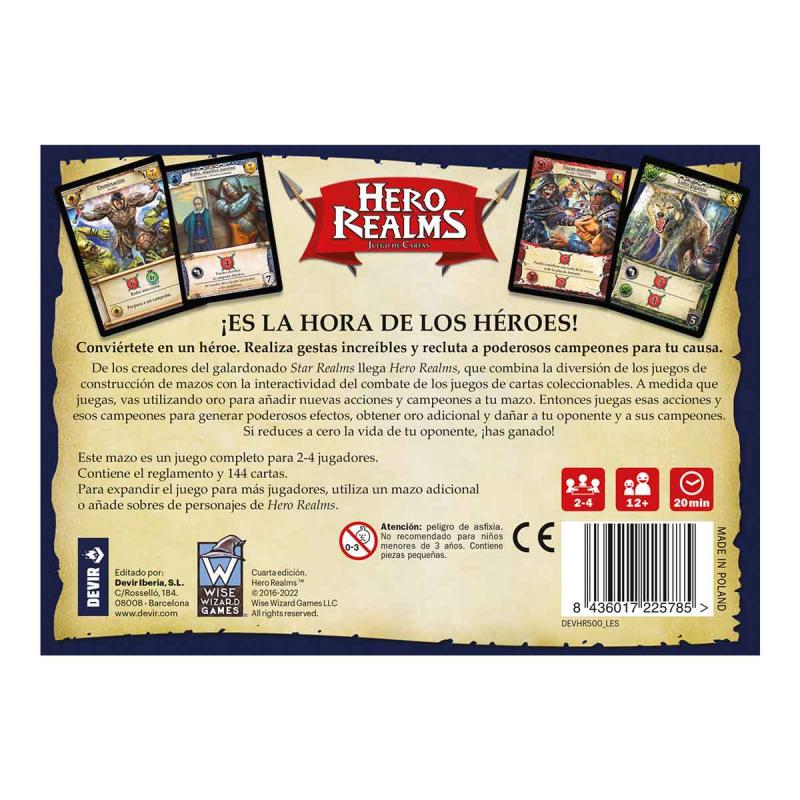 De los creadores del galardonado Star Realms llega Hero Realms, que combina la diversión de los juegos de construcción de mazos con la interactividad del combate de los juegos de cartas coleccionables. A medida que juegas, vas utilizando oro para añadir nuevas acciones y campeones a tu mazo. Entonces juegas esas acciones y esos campeones para generar poderosos efectos, obtener oro adicional y dañar a tu oponente y a sus campeones. Si reduces a cero la vida de tu oponente, ¡has ganado!