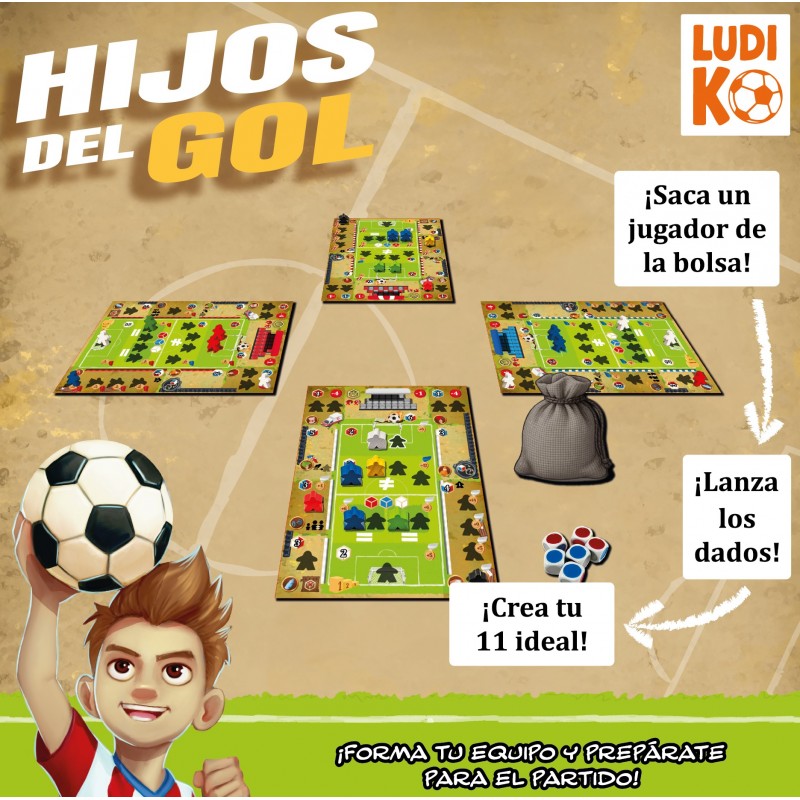 En Hijos del Gol, cada jugador intenta formar el mejor 11 titular y sumar el máximo de puntos. En tu turno, sacas un meeple de la bolsa, lanzas los 6 dados y lo colocas en una zona de tu tablero según la combinación obtenida. Cada zona otorga efectos o puntos, y podrás realizar acciones como fichar, lesionar o expulsar jugadores rivales, crear tu 11 inicial, llevarlos a la grada . La partida termina cuando alguien completa su 11: se calculan los puntos y por cada 10 puntos se marca un gol. ...