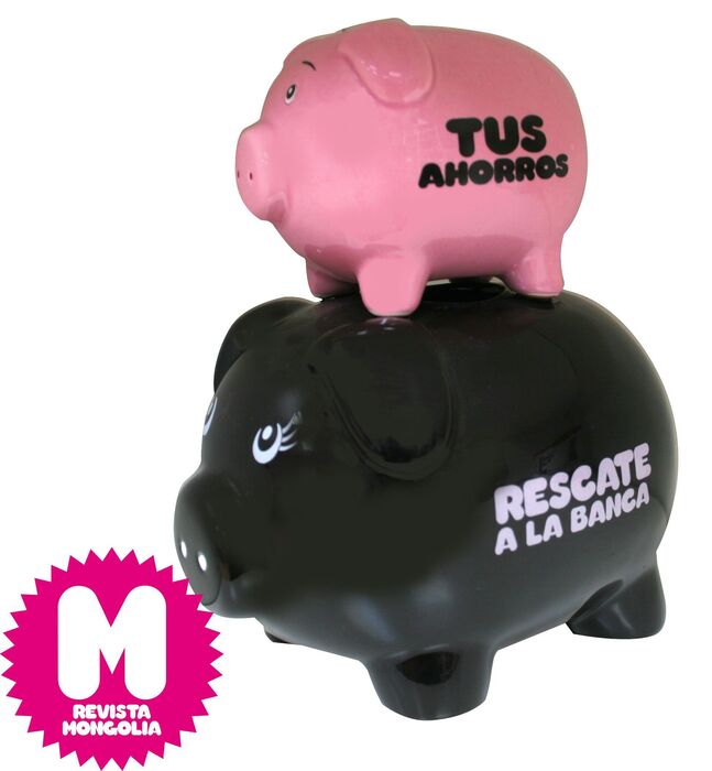 Hucha de cerámica cerditos Mongolia. "Tus ahorros - Rescate a la banca", de la Revista Mongolia. Pon tus ahorros en el cerdito superior... para que caigan en el de abajo.