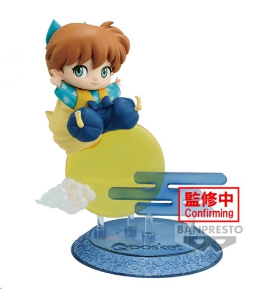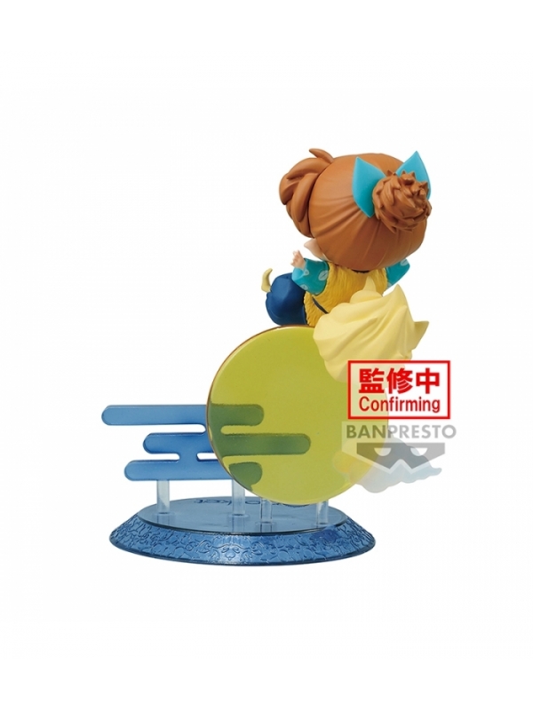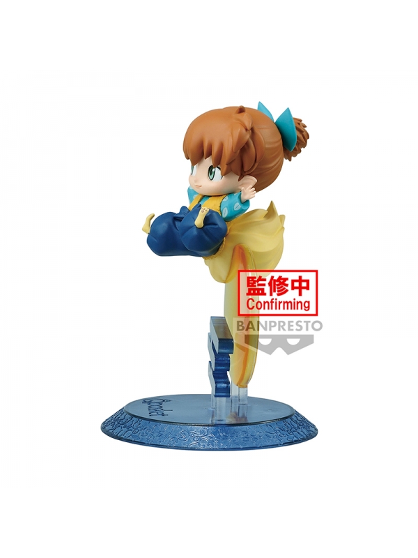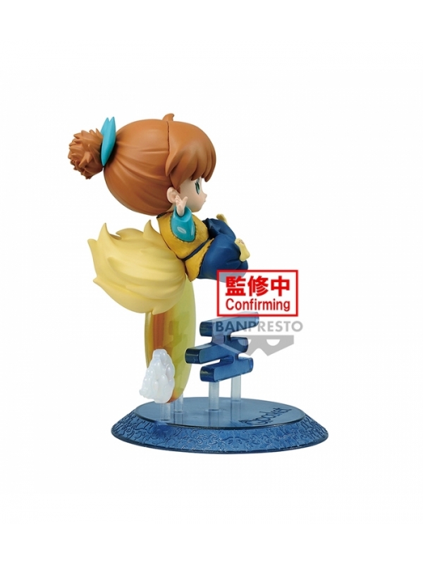 Esta figura es de Shippo, uno de los personajes carismáticos de la serie "Inuyasha", parte de la colección Q posket together de Banpresto. La figura mide aproximadamente 6 cm de altura y muestra a Shippo sentado sobre una media luna, capturando su naturaleza juguetona y adorable. El diseño incluye detalles típicos de Shippo como su cabello naranja, grandes ojos verdes y su traje tradicional azul y amarillo.