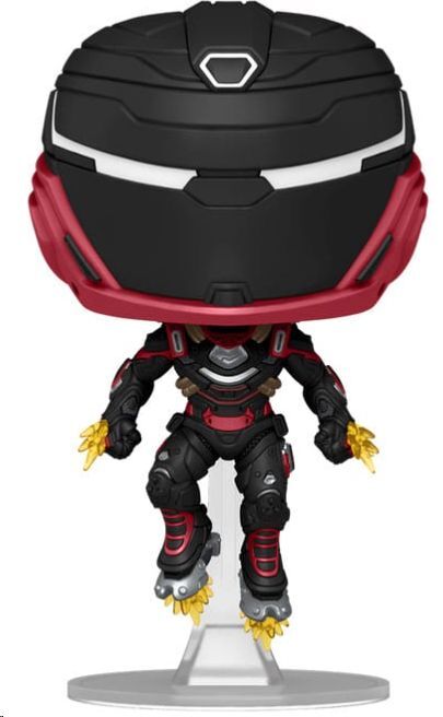 El traje muestra un cuerpo totalmente recubierto por placas negras con detalles en rojo, lo que resalta su estilo más agresivo y preparado para el combate. Los propulsores activados en pies y manos aportan ese toque de acción en pleno vuelo, apoyado por una base transparente que la mantiene suspendida.