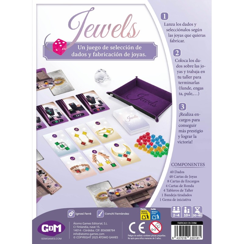 Jewels es un juego de estrategia de 2 a 4 jugadores y a partir de 10 años, en el que te conviertes en un auténtico joyero: seleccionas gemas con dados, los transformas en colgantes, anillos, pendientes o pulseras mediante cartas de diseño, y las engastás con habilidad para maximizar tu puntuación.
