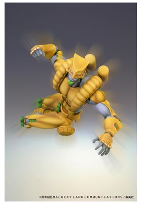 El diseño incluye los icónicos colores amarillos y verdes que hacen referencia a la estética de la parte 3, Stardust Crusaders, y ofrece una representación fiel de las líneas de acción del personaje. Cada detalle, desde las articulaciones hasta las proporciones, ha sido meticulosamente trabajado para ofrecer una pieza robusta y dinámica.