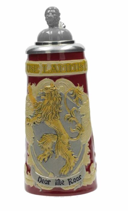 ¿Quién se hará finalmente con el trono de hierro? El que lo consiga, bien pudiera celebrarlo con una buena cerveza en estas jarras de cerámica con relieve, de estilo alemán. Cada una de ellas está dedicada a una de las principales casas y está decorada con motivos que representan a la familia en cuestión, incluida la tapa con un elemento distintivo en 3D.Se presentan en caja ilustrada a todo color.
