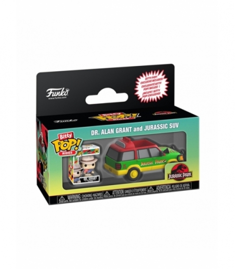 Esta figura Bitty POP! Ride de Jurassic Park muestra el icónico Jeep del parque acompañado del Dr. Grant en formato mini, ofreciendo una recreación encantadora y llena de detalles pese a su tamaño reducido. El diseño captura la esencia de la aventura clásica con colores y formas muy reconocibles.