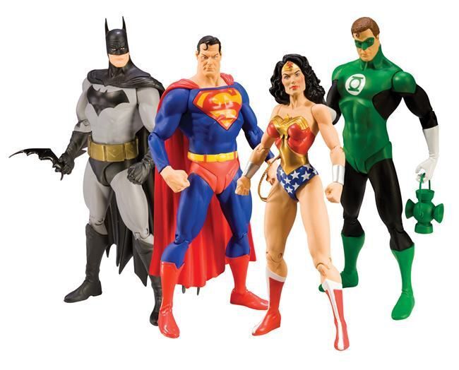Diseñados por Alex Ross y basados en su aclamado cómic de DC Justicia. La caja contiene 4 figuras totalmente articuladas: Batman, Superman, Wonder Woman y Green Lantern. Además también lleva el número 1 de Justice (en inglés). Cada figura mide unos 18cm de altura e incorpora base expositora.