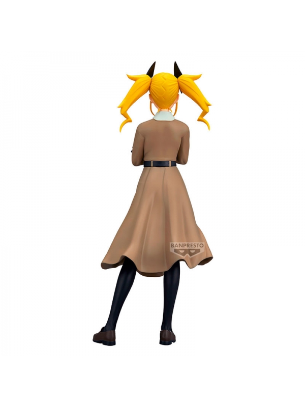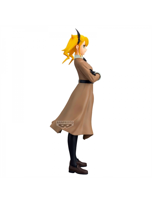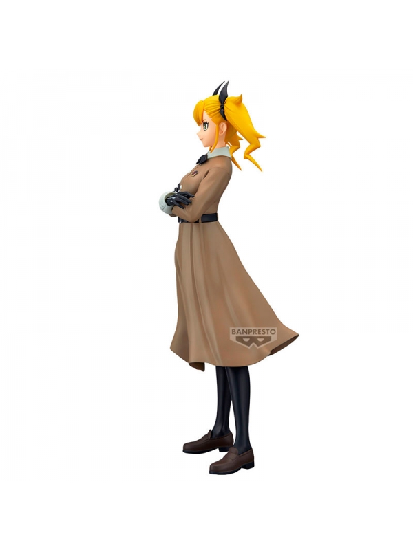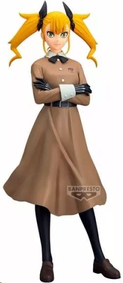El nivel de detalle en esta figura es sobresaliente, con un esculpido preciso que resalta cada pliegue de su uniforme y la textura de su cabello rubio atado en dos coletas. La vestimenta en tonos marrones con detalles en negro ha sido recreada con fidelidad, aportando una sensación de realismo y movimiento. Su expresión meticulosa y los acabados de pintura refuerzan la calidad de la pieza, haciendo que destaque en cualquier colección.