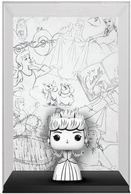 La figura de Cenicienta está diseñada en blanco y negro, destacando su vestido y peinado icónico en una estética de esbozo. Esta apariencia la hace única y diferente a otras versiones a color, invitando a los coleccionistas a apreciar el proceso creativo detrás de la magia de Disney. La caja de fondo complementa a la figura, mostrando detalles y diseños originales que rinden homenaje a la obra de arte detrás del clásico.