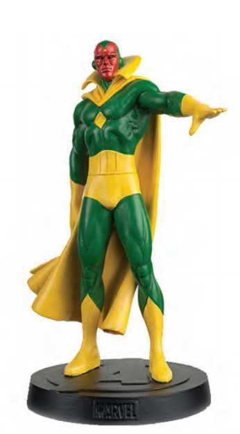 Esta reproducción toma su pose directamente de la portada que hizo John Buscema para Avengers núm. 57 USA, en la que la Visión hizo su debut.