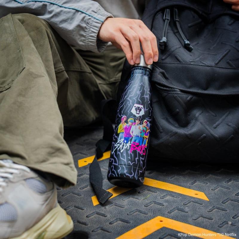 Luce un estilo potente con esta botella de agua Saja Boys inspirada en el universo de Las guerreras K-pop. Su diseño en tonos oscuros con detalles gráficos y la ilustración del grupo aportan una estética moderna y llena de actitud que destaca en cualquier entorno.