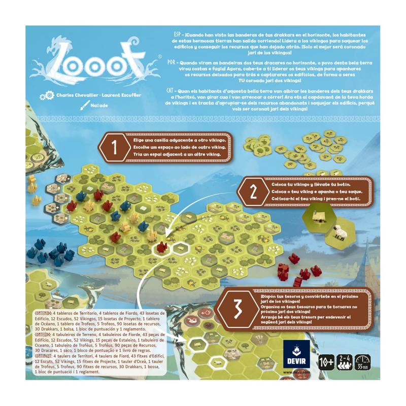 Looot es uno de los primeros títulos incluidos en la colección Next de Devir, un sello pensado para todos aquellos que quieran dar el siguiente paso en la afición de los juegos de mesa, tras haber probado títulos de iniciación. Con reglas fáciles de entender y sesiones de juego rápidas, Looot es un imprescindible en cualquier ludoteca. ¡Posiciona tus guerreros con sabiduría para lograr ser coronado jarl de los vikingos!