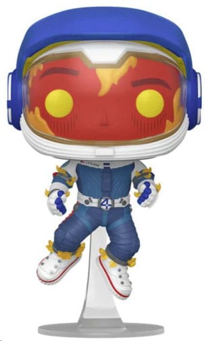 El diseño mezcla el uniforme de astronauta clásico con los primeros indicios del poder ígneo de Johnny: llamas que brotan de sus manos, pies y rostro, que se ve rojo encendido tras la visera del casco. La base transparente le da una pose flotante, como si estuviera en plena transformación en medio del espacio.