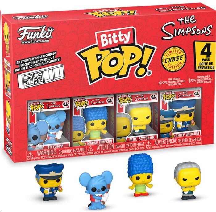 Cada personaje está representado con su estilo característico: el Jefe Wiggum con su uniforme policial, Rasca con su guitarra y gesto rebelde, y Marge con su peinado azul inconfundible y su vestido rojo. Aunque diminutos, estos Bitty Pop! conservan todo el humor y la esencia de la serie más irreverente de la televisión.
