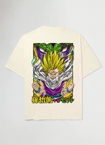Camiseta beige de corte oversize que destaca por su espectacular estampado en la parte trasera, donde se representa a un imponente guerrero de cabello dorado en plena transformación. La ilustración captura el momento de máxima tensión mientras se enfrenta a un adversario de tono verde intenso, transmitiendo toda la energía y determinación del combate.