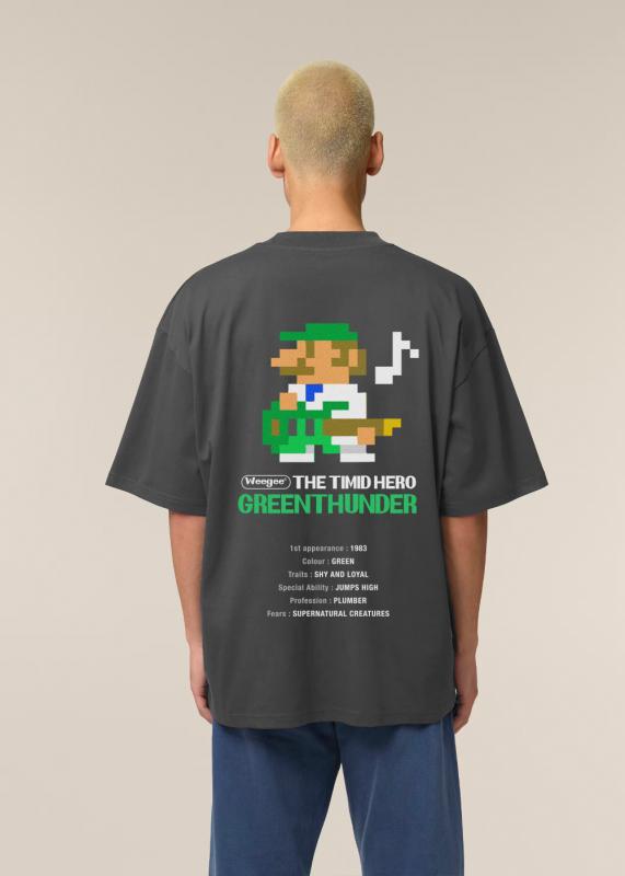 La camiseta GREENTHUNDER VERDE devestido algo de MADE IN JAPAN es puro flow ochentero con sabor a píxel. El diseño en la espalda nos trae a un héroe vestido de verde, guitarra en mano, con pinta de que lo sacaron directo de una vieja consola. ¿Te suena algo? Pues sí, es un claro guiño al personaje más tímido, leal y salta-alto del mundo de los videojuegos, ese que siempre acompaña pero pocas veces se lleva el foco hasta ahora.