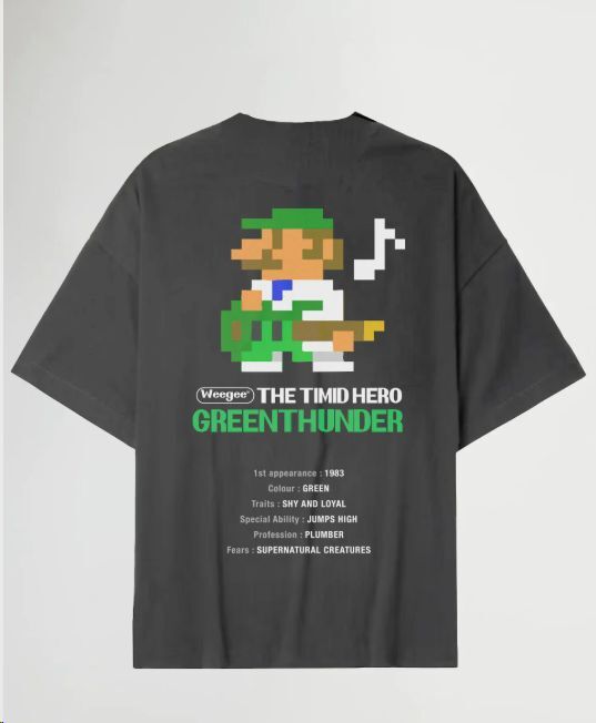 La camiseta GREENTHUNDER VERDE devestido algo de MADE IN JAPAN es puro flow ochentero con sabor a píxel. El diseño en la espalda nos trae a un héroe vestido de verde, guitarra en mano, con pinta de que lo sacaron directo de una vieja consola. ¿Te suena algo? Pues sí, es un claro guiño al personaje más tímido, leal y salta-alto del mundo de los videojuegos, ese que siempre acompaña pero pocas veces se lleva el foco hasta ahora.