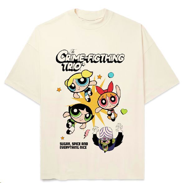 Camiseta de estilo urbano con un diseño fan art que rinde homenaje a un trío de heroínas animadas que reparten justicia con mucha energía y actitud. En el centro, tres figuras dinámicas surcan el aire mientras una criatura de aspecto villanesco las observa desde abajo.