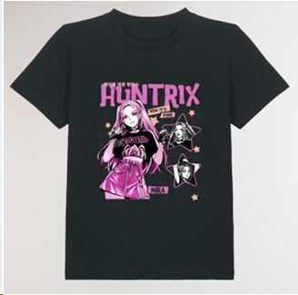 Camiseta infantil Made in Japan con diseño de Huntrix Mira, ideal para quienes disfrutan del estilo anime con un toque moderno y atrevido. Su estampado combina tonos rosas y negros con un acabado brillante que destaca sobre el fondo oscuro.