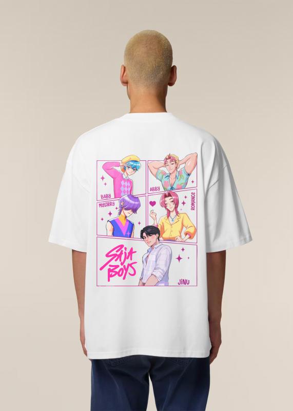 Luce un estilo diferente con esta camiseta Made in Japan, diseñada con un colorido estampado en la parte trasera que reúne a un grupo de cinco personajes ilustrados con estética vibrante y juvenil. Cada figura aparece enmarcada en un recuadro al estilo cómic, destacando por su personalidad y colores llamativos.