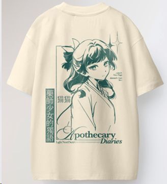 Camiseta de estilo japonés con ilustración inspirada en una joven protagonista de estética manga, representada con líneas suaves y un elegante diseño en tono verde sobre fondo crema. El arte combina tipografía y elementos gráficos que evocan el ambiente de las historias ambientadas en la corte imperial, aportando un aire delicado y muy reconocible dentro de la cultura visual del anime.