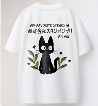 Camiseta de inspiración japonesa con un diseño minimalista protagonizado por un simpático gato negro de estilo anime. La ilustración se acompaña de pequeñas estrellas, hojas y tipografía japonesa, creando una composición sencilla y encantadora que recuerda al universo de la animación japonesa clásica.