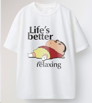 Relájate al máximo con esta camiseta Relaxing protagonizada por Shinnosuke. Su diseño sencillo y divertido muestra al personaje en modo total desconexión junto al mensaje Lifes better when relaxing, perfecta para quienes saben disfrutar del momento.