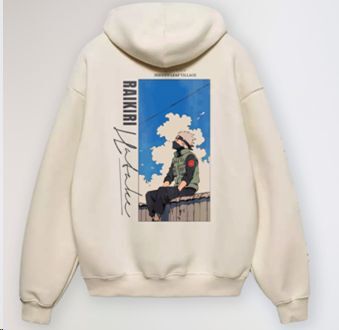 El estampado ocupa gran parte de la parte trasera de la prenda y se acompaña de tipografía moderna y caracteres japoneses que refuerzan su estilo urbano inspirado en el anime. El contraste entre la ilustración y el tono claro de la sudadera hace que el diseño destaque con gran fuerza visual.
