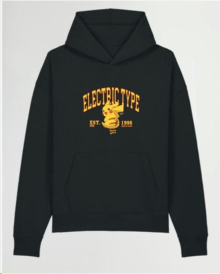 Sudadera negra de estilo urbano con estampado fan art Made in Japan que homenajea al tipo eléctrico más emblemático del arte alternativo. En el centro destaca un diseño vibrante en tonos amarillo y naranja con el texto Electric Type, acompañado del número #025 y la fecha Est. 1996.