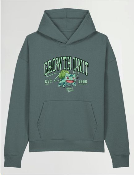 Sudadera de algodón en color verde grisáceo con un diseño fan art Made in Japan inspirado en criaturas vegetales de estilo retro noventero. El estampado central incluye la frase Growth Unit acompañada de una ilustración de estética urbana y detalles como Bloom Tactics, Est. 1996