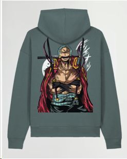 Sudadera verde grisácea con un imponente diseño fan art Made in Japan protagonizado por un espadachín de mirada desafiante y estilo samurái. La ilustración trasera muestra al personaje con tres espadas, postura firme y capa roja ondeando, todo ello bajo una luna llena que potencia el dramatismo del conjunto.