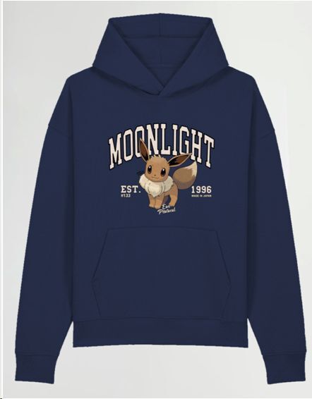 Sudadera azul marino de estilo universitario con un diseño encantador y nostálgico. En el frontal destaca el texto "Moonlight" acompañado de una entrañable criatura de grandes orejas, ojos expresivos y pelaje esponjoso, que aporta un toque adorable y muy reconocible para los fans del arte japonés. El diseño se completa con detalles como "EST. 1996" y referencias tipográficas que evocan las clásicas universidades americanas, fusionando estética vintage con cultura pop.