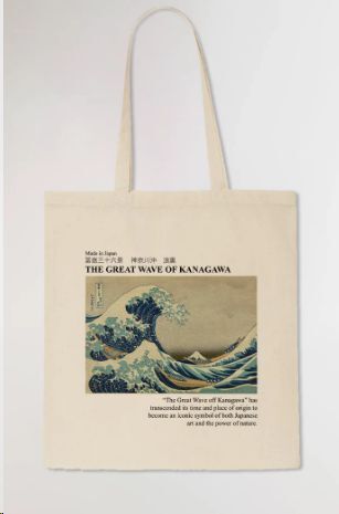 Esta bolsa de tela resistente rinde homenaje a una de las obras más icónicas de Japón: "La Gran Ola de Kanagawa". Perfecto para quienes aprecian la fusión de funcionalidad y arte, este accesorio es ideal para el uso diario.