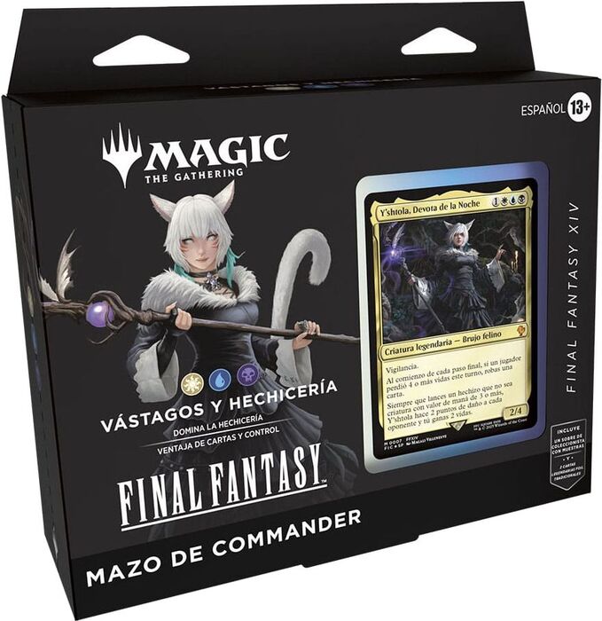 El poder del Éter fluye a través del multiverso, y en este mazo de Commander, la magia y la estrategia se unen en un equilibrio perfecto. Inspirado en FINAL FANTASY XIV, Vástagos y Hechicería te pone al mando de los poderosos hechiceros de Eorzea, liderados por Yshtola, Nights Blessed, la sabia miqo'te capaz de dominar las energías arcanas con maestría.