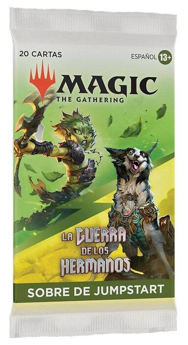 Sobre de Jumpstart de La Guerra de los Hermanos. Cada sobre tiene una temática. Abre dos sobres y mézclalos para hacer combinaciones alocadas y vivir una experiencia de juego única perfecta para una partida casual y rápida, para jugadores veteranos que quieran volver a Magic o para que los jugadores nuevos disfruten aprendiendo a jugar de una forma sencilla.