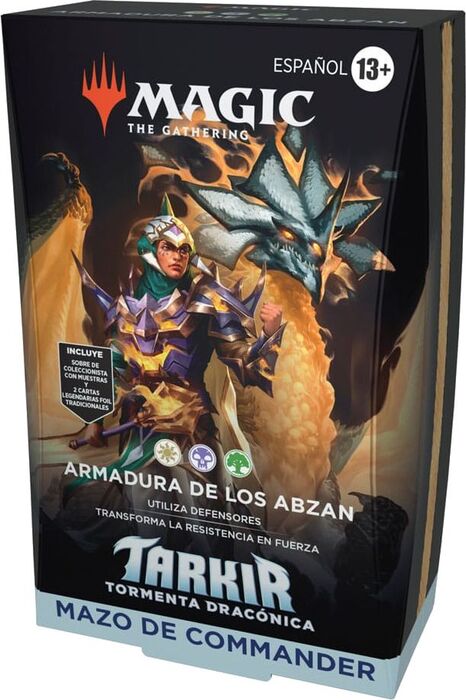 https://comicstores.es/producto/magic-tarkir-dragonstorm-mazo-de-commander-abzan-blanco-negro-y-verde-castellano_587841587841MAGIC - TARKIR DRAGONSTORM MAZO DE COMMANDER ABZAN (BLANCO, NEGRO Y VERDE) - CASTELLANOEnfréntate a tus amigos con criaturas poderosas y hechizos espectaculares en Commander, el formato para varios jugadores más popular de Magic. Desafía a tus amigos o prueba cada estilo de juego único con los 5 mazos de Tarkir: tormenta dracónica: Armadura de los Abzan, Ofensiva de los Jeskai, Alzamiento de los Sultai, Impulso de los Mardu y Rugido de los Temur.