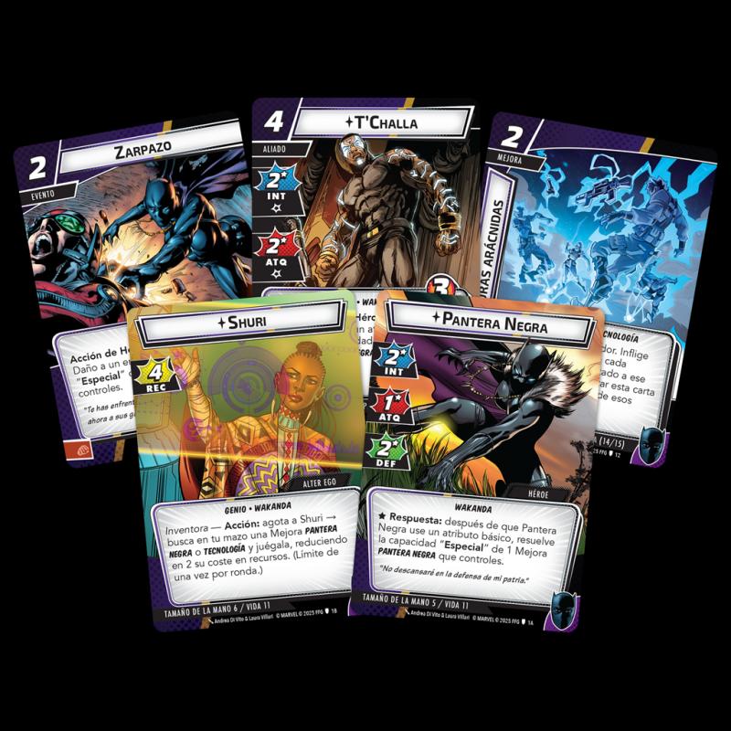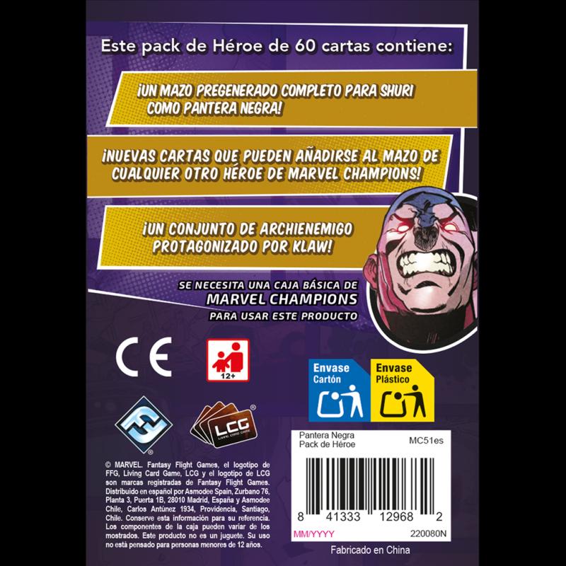 Este pack de Héroe de 60 cartas contiene: ¡Un mazo pregenerado completo para Shuri como Pantera Negra! ¡Nuevas cartas que pueden añadirse al mazo de cualquier otro Héroe de Marve Champions! ¡Un conjunto de archienemigo protagonizado por Klaw!