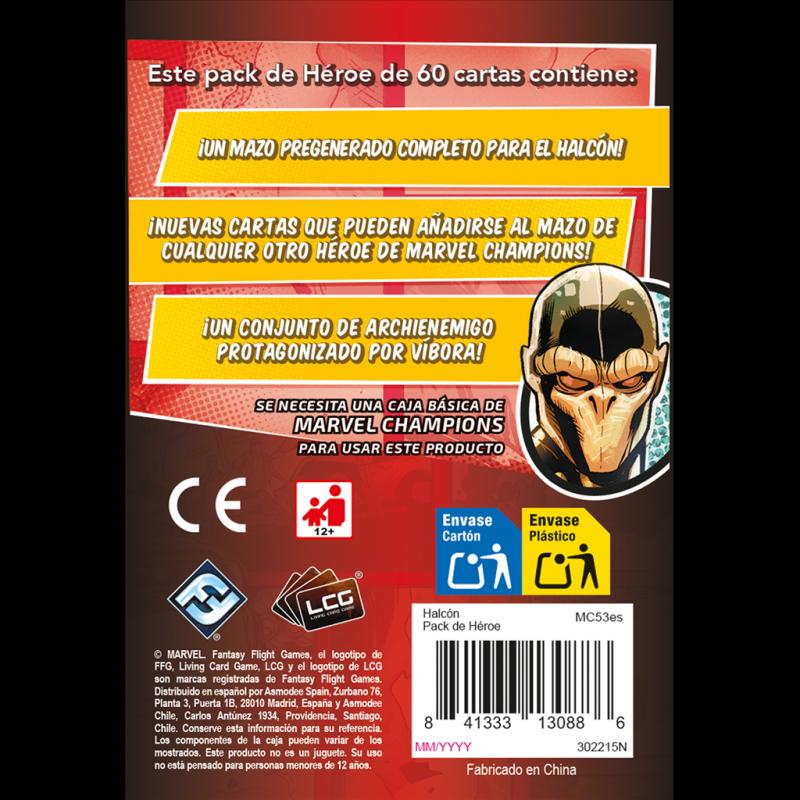 Este pack de Héroe de 60 cartas contiene: ¡Un mazo pregenerado completo para Halcón! ¡Nuevas cartas que pueden añadirse al mazo de cualquier otro héroe de Marvel Champions! ¡Un conjunto de archienemigo protagonizado por Víbora!