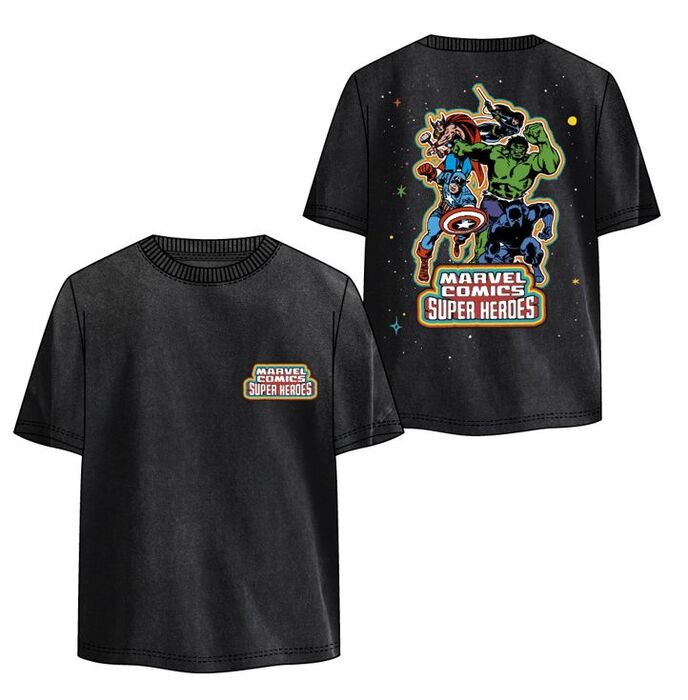 Camiseta Marvel Comics Super Heroes diseñada para quienes viven la acción y la aventura en su día a día, con un estilo llamativo que reúne a algunos de los personajes más icónicos del universo Marvel en una composición llena de energía y color sobre fondo negro.