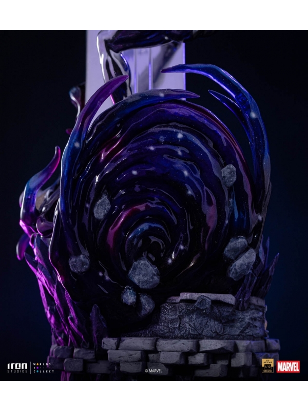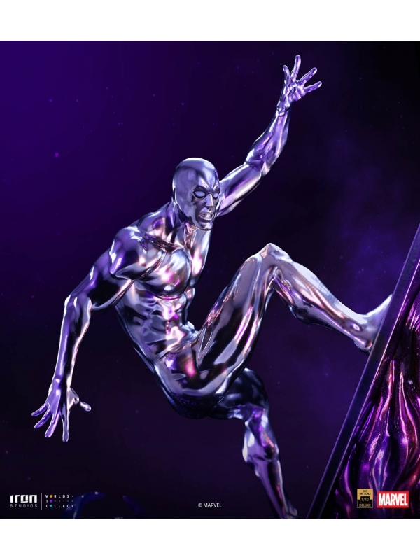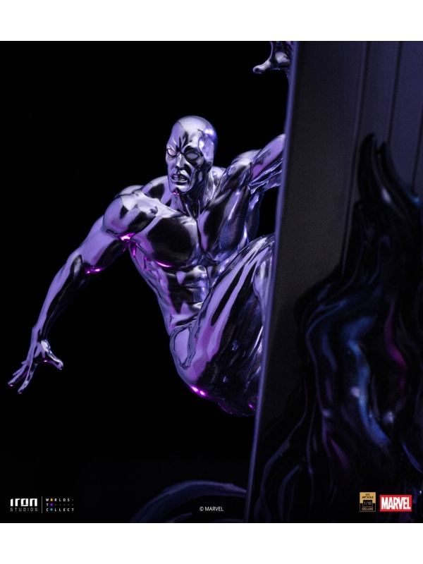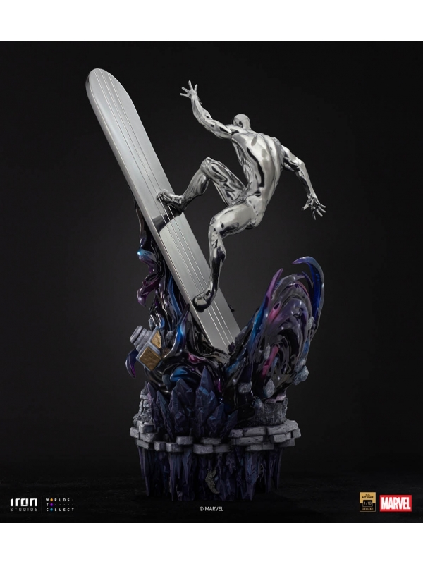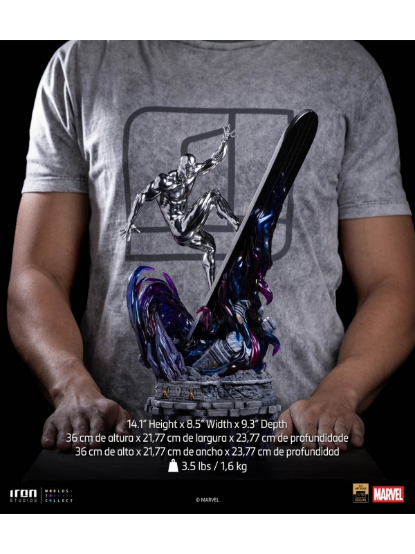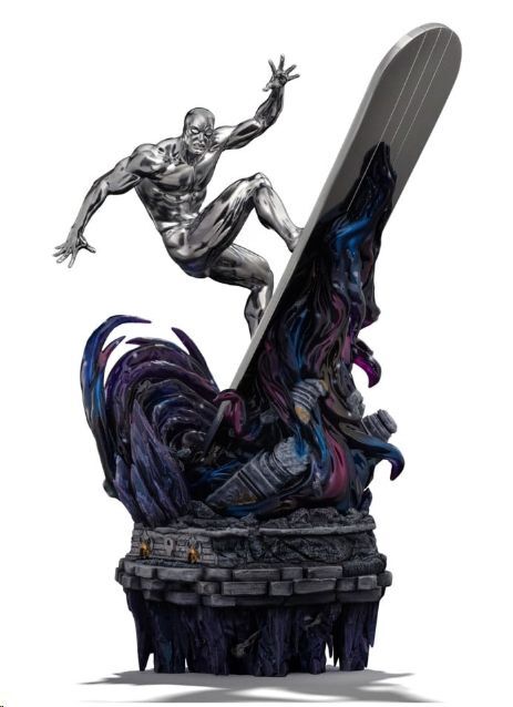 Fabricada por Iron Studios, esta pieza destaca por su cuidada escultura y un trabajo de pintura muy detallado, especialmente en los acabados metalizados del cuerpo de Silver Surfer y en las texturas orgánicas y oscuras del diorama. Con una altura aproximada de 36 cm, ofrece una presencia imponente, pensada para convertirse en uno de los puntos centrales de cualquier vitrina.
