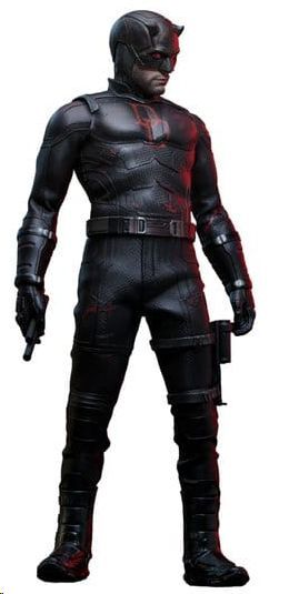 El diseño del traje destaca por su acabado único, con una capa negra aplicada sobre el clásico uniforme rojo, dejando ver zonas desgastadas que revelan el color original. Este efecto aporta profundidad y realismo, evocando su evolución durante la historia. El conjunto se completa con guanteletes, rodilleras, funda para el Billy Club y botas largas, todo en tonos oscuros que refuerzan su estilo más sigiloso.