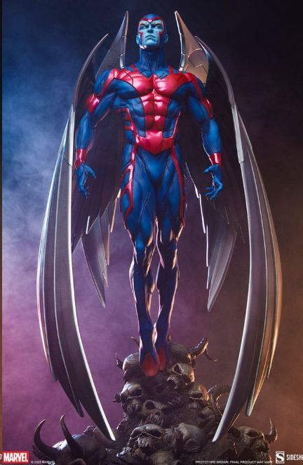 Diseñada con un nivel excepcional de detalle, la estatua presenta las enormes alas metálicas de Archangel, desplegadas en todo su esplendor, mientras se alza sobre una base decorada con cráneos que evocan un ambiente sombrío y apocalíptico. Los colores vivos de su traje, que combinan el azul y el rojo característicos, resaltan su musculatura y presencia imponente.