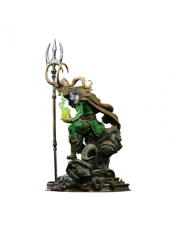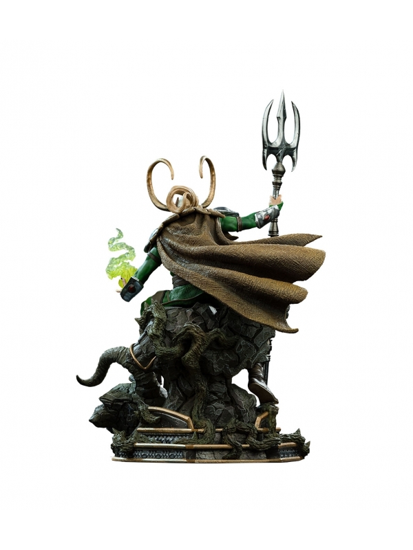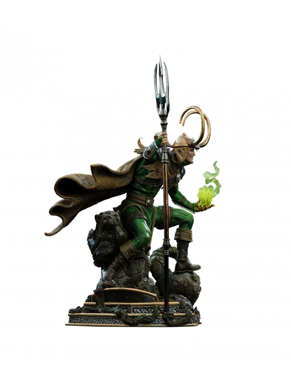 La escultura muestra a Loki en una pose dinámica, sosteniendo su cetro mientras conjura energía mística en la mano, sobre una base tematizada con acabado rocoso que refuerza la sensación de movimiento y dramatismo. El nivel de detalle en la armadura, la capa y las texturas convierte esta figura en una pieza destacada dentro de cualquier colección.