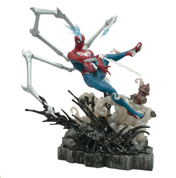 La figura muestra a Spider-Man en una pose de acción espectacular, con sus característicos lanzadores de telaraña desplegados, enfrentándose a una amenaza no vista. El detallismo en el diseño de los tentáculos de Doctor Octopus que emergen desde la base añade un nivel de dramatismo y movimiento que captura la esencia del conflicto en el juego. La base del diorama incorpora elementos urbanos destrozados, lo que añade un contexto visual que enriquece la narrativa de la figura.