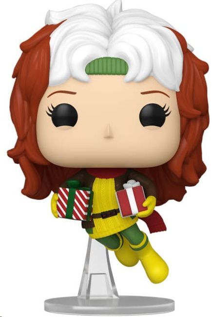 Rogue aparece en posición de vuelo gracias a una base transparente, cargando dos regalos envueltos con entusiasmo, lista para repartir alegría. Su cabello bicolor y su expresión dulce la hacen destacar como una de las figuras más entrañables de la colección.